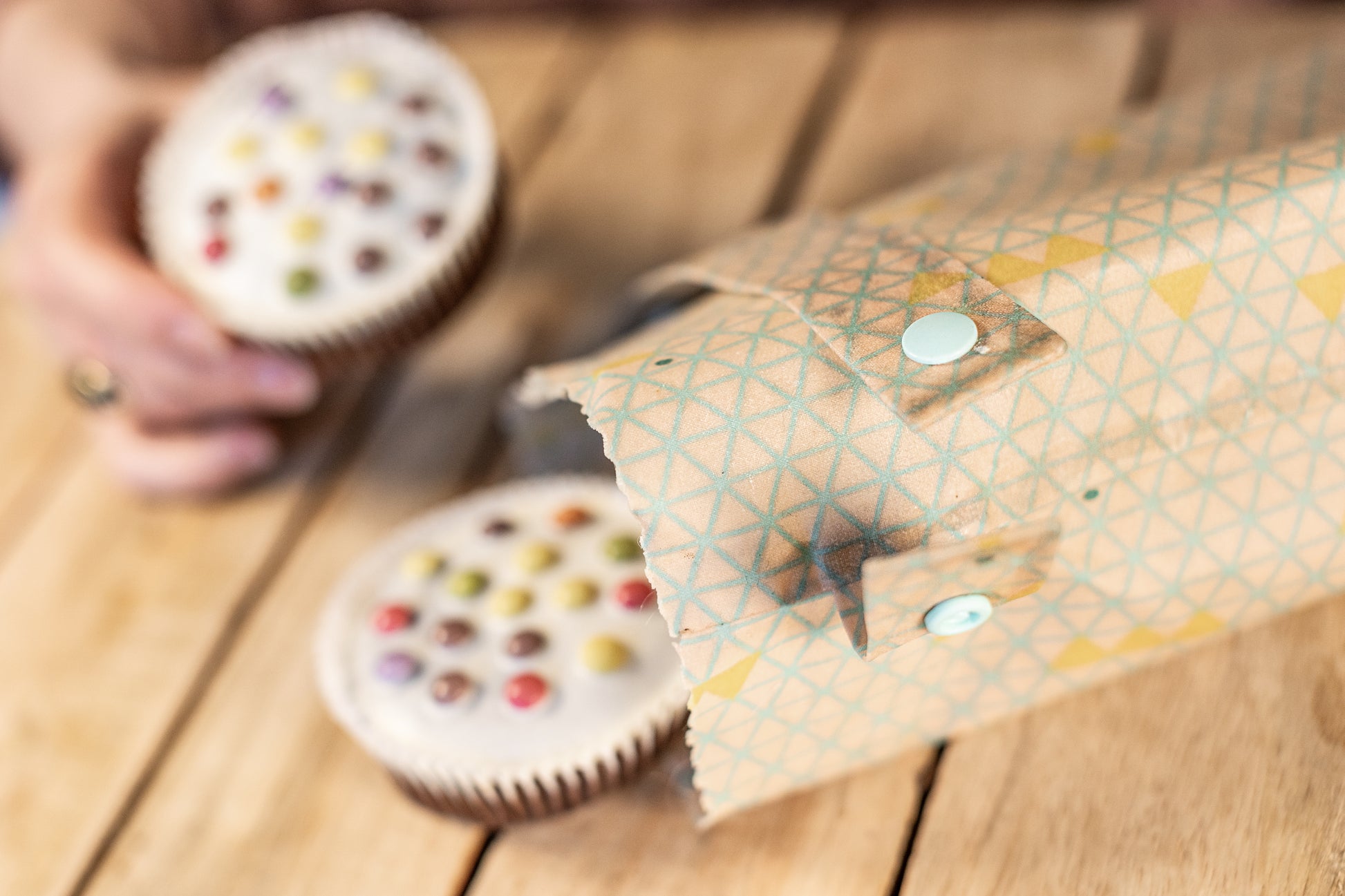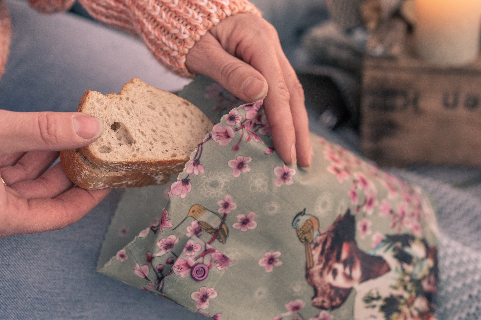 100% Baumwolle getränkt mit einer eigenen Mischung aus Bio-Bienenwachs, Bio-Jojoba-Öl und Baumharz.